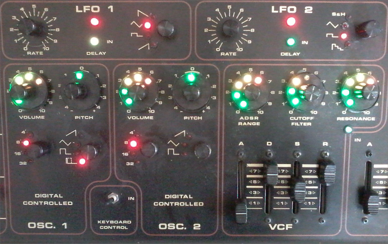 To make it Total Recall I had to make a view for all controllers. In the picture below you can see the new Crumar with additional visual feedback: Almost all encoders (e.g Volume Oscillators) have a ledring surrounding it, showing the correct position, all selectors (e.g. LFO wave selector, OSC footage) have leds for the chosen position, and both Envelope Generators (VCF ADSR, VCA ADSR) have motorized faders. All encoders and selectors have been replaced with relative encoders: They don't have a minimum or maximum value.